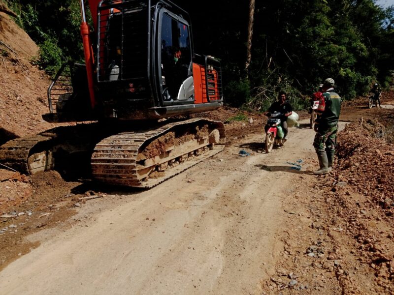 Aceh Tengah – Anggota Koramil 04/Bintang, Sertu Haidir Adami, melaksanakan pengawasan dan pengamanan kegiatan pembersihan material longsor yang menimbun badan jalan lintas Takengon–Bintang, tepatnya di Desa Jamur Konyel, Kecamatan Bintang, Kabupaten Aceh Tengah, Selasa (03/03/2026).