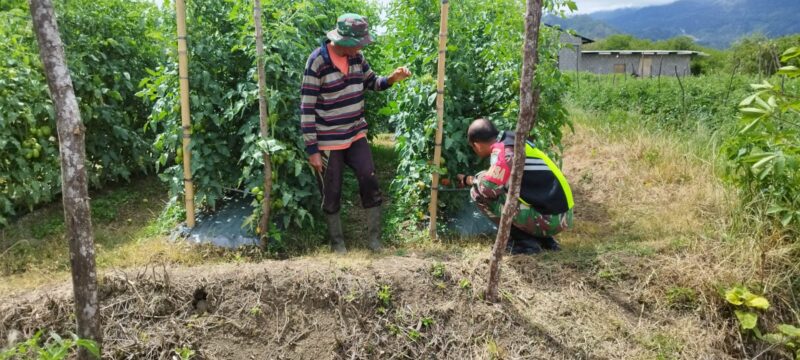 Koptu Ferdianto mendampingi salah seorang petani, Aman Sahri, membersihkan tanaman tomat di kebunnya. Kehadiran Babinsa di tengah masyarakat diharapkan dapat memberi semangat sekaligus mendorong warga agar lebih giat dalam mengelola lahan pertanian.