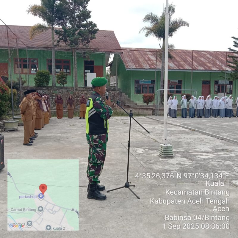 Takengonpilargayonews.com | Babinsa Koramil 04/Bintang, Sertu Haidir Adami, mewakili Danramil 04/Bintang menghadiri kegiatan upacara bendera merah putih di SMA Negeri 7 Takengon, Desa Kuala 2, Kecamatan Bintang, Kabupaten Aceh Tengah, Senin (1/9/2025).
