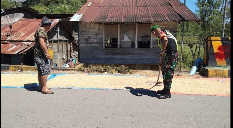 Babinsa Koramil 05/Linge Cek Penjemuran Gabah Petani, Pastikan Kualitas dan Teknik Pengeringan Manual Terjaga