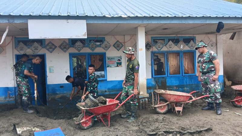 Takengon – Kodim 0106/Aceh Tengah, yonif 114/SM dan YTP 854 pameu melalui personel yang tergabung melaksanakan pembersihan lanjutan sarana pendidikan di SD Negeri 9, kantor desa, Mushola mendale kec, kebanyakan dan Masjid di desa tebuk, kec pegasing Kabupaten Aceh Tengah, Sabtu (27/12/ 2025).