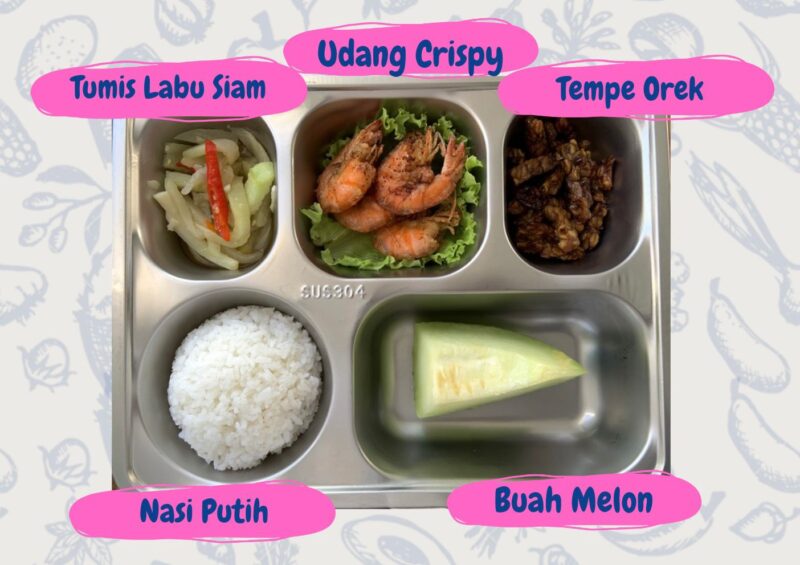 Menu yang disajikan dalam kegiatan tersebut terdiri dari nasi putih, udang crispy, tumis labu siam, tempe orek, serta buah melon. Menu ini dirancang untuk memenuhi kebutuhan gizi pelajar dengan komposisi seimbang.