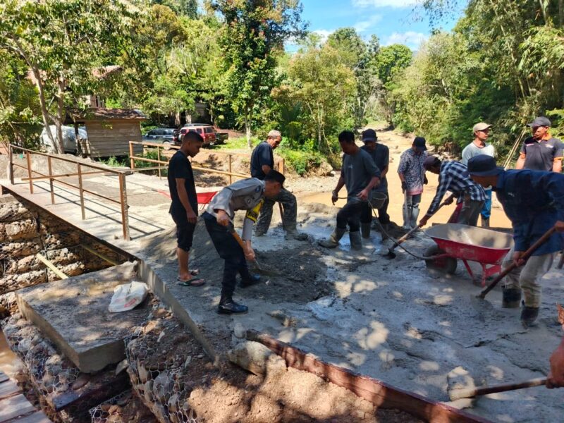 Aceh Tengah — Aparat kepolisian dari Polsubsektor Rusip Antara Polres Aceh Tengah bersama masyarakat mempercepat pemulihan akses antar kampung melalui kegiatan gotong royong pengecoran lantai jembatan darurat di Kecamatan Rusip Antara, Kabupaten Aceh Tengah, Minggu (19/4/2026).