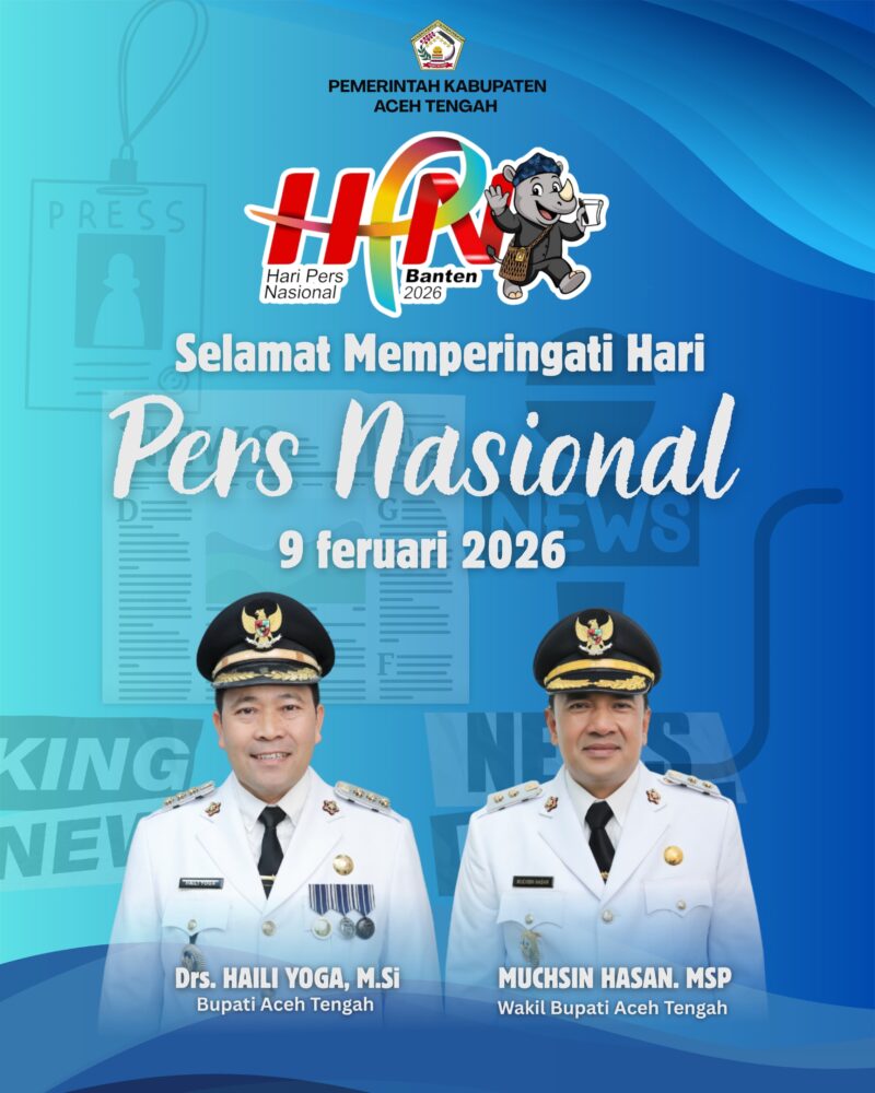 Takengon – Bupati Aceh Tengah Drs. Haili Yoga, M.Si bersama Wakil Bupati Aceh Tengah, Muchsin Hasan, MSP menyampaikan ucapan selamat memperingati Hari Pers Nasional (HPN) tahun 2026 kepada seluruh insan pers, khususnya yang bertugas di Kabupaten Aceh Tengah. Ucapan tersebut disertai apresiasi atas peran strategis pers dalam menyampaikan informasi yang akurat, berimbang, dan edukatif kepada masyarakat.