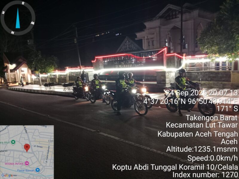 Takengon – Anggota Kodim 0106/Aceh Tengah melaksanakan kegiatan patroli malam di wilayah Kabupaten Aceh Tengah pada Rabu malam, 24 September 2025.