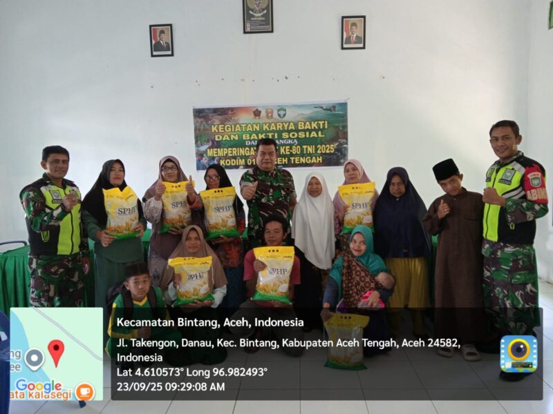 Takengon | Pilargayonews.com – Dalam rangka memperingati Hari Ulang Tahun (HUT) ke-80 Tentara Nasional Indonesia (TNI) tahun 2025, Koramil 04/Bintang Kodim 0106/Aceh Tengah melaksanakan kegiatan bakti sosial di Desa Merodot, Kecamatan Bintang, Selasa (23/9/2025).