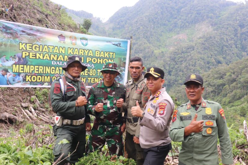 Takengon – pilargayonews.com|Komandan Kodim 0106/Aceh Tengah Letkol Inf Raden Herman Sasmita bersama Kapolres Aceh Tengah AKBP Muhammad Taufiq S.I.K, MH, ajak masyarakat dataran tinggi Gayo melaksanakan penanaman 1500 pohon dalam rangka menyambut Hut TNI ke 80 di bur kelieten desa nosar kec, bintang Kab, Aceh Tengah. Rabu(01/10/25)