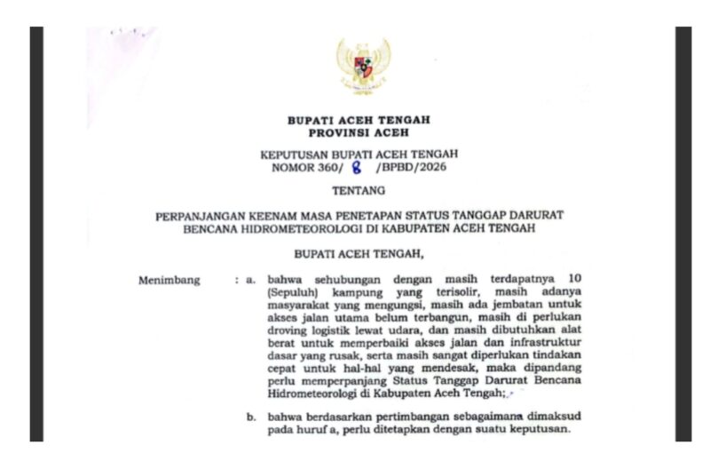 TAKENGON – Pemerintah Kabupaten Aceh Tengah resmi memperpanjang masa penetapan status Tanggap Darurat Bencana Hidrometeorologi untuk yang keenam kalinya. Keputusan ini tertuang dalam Keputusan Bupati Aceh Tengah Nomor 360/8/BPBD/2026 tertanggal 22 Januari 2026