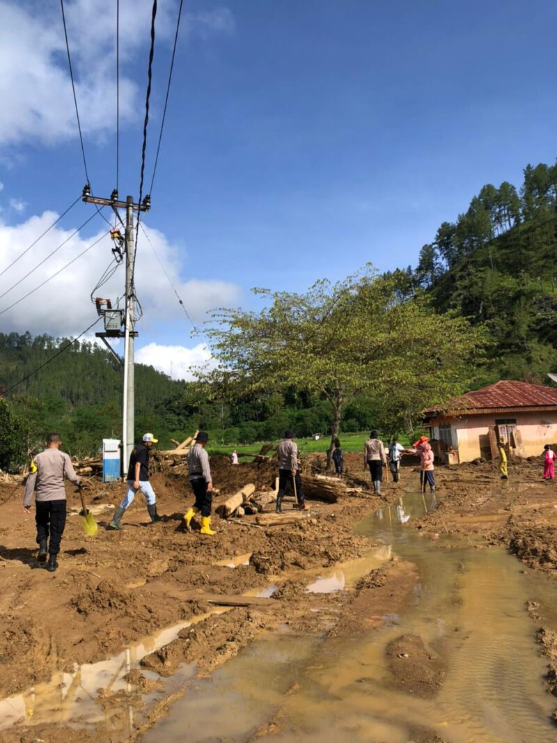 Dengan semangat kebersamaan, personel Polri dan masyarakat bahu-membahu membersihkan sisa lumpur, material banjir, dan puing-puing tanah longsor yang masih menutupi rumah dan lingkungan sekitar. Kegiatan ini menjadi bagian dari pemulihan lingkungan sekaligus wujud empati Polri terhadap korban bencana.