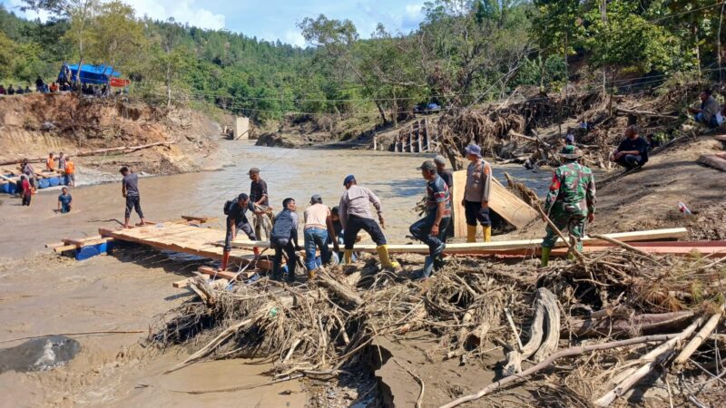 Jembatan darurat tersebut dibangun dengan memanfaatkan drum dan material kayu agar dapat segera digunakan masyarakat dalam menunjang aktivitas sehari-hari, baik menuju desa sekitar maupun ke luar wilayah kecamatan.