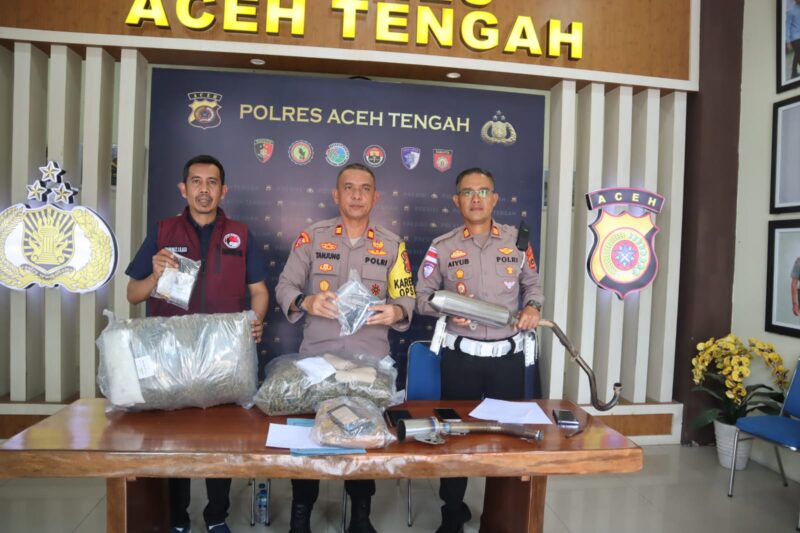 Press release dipimpin oleh Kapolres Aceh Tengah AKBP Muhamad Taufiq, S.I.K., M.H., yang diwakili Kabag Ops AKP Hendra Gunawan Tanjung, S.H., didampingi Kasat Resnarkoba AKP Fakhrurrazi, S.Si., MSM., serta Kasat Lantas AKP Aiyub, S.E., M.H.