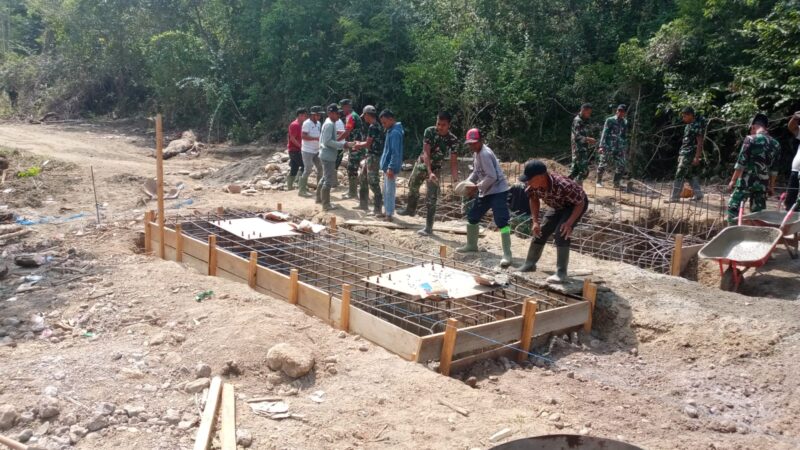 Adapun kegiatan yang telah dilaksanakan meliputi pengecoran pada titik 1A, pembengkokan besi untuk kerangka pengecoran abutmen, serta pelangsiran material menuju titik pekerjaan (2). Sinergi antara personel TNI dan masyarakat terlihat aktif di lapangan demi mempercepat proses pembangunan.