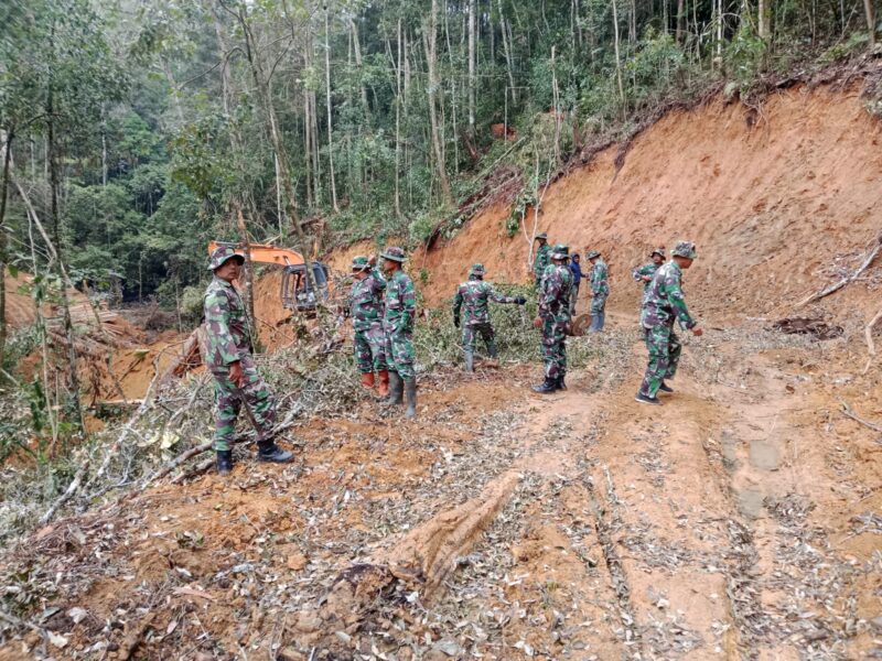 Takengon- Satgas TMMD ke-126 Kodim 0106/Aceh Tengah melaksanakan gotong royong bersama warga membersihkan pohon di sepanjang jalur sasaran TMMD yaitu di Titik nol, terus berlanjut, memasuki hari ke 9 untuk membersihkan rute penyiapan badan jalan dengan di bantu alat berat Excavator bertempat di desa kute keramil. Kec. Linge. Kab Aceh Tengah.Kamis (16/10/25)