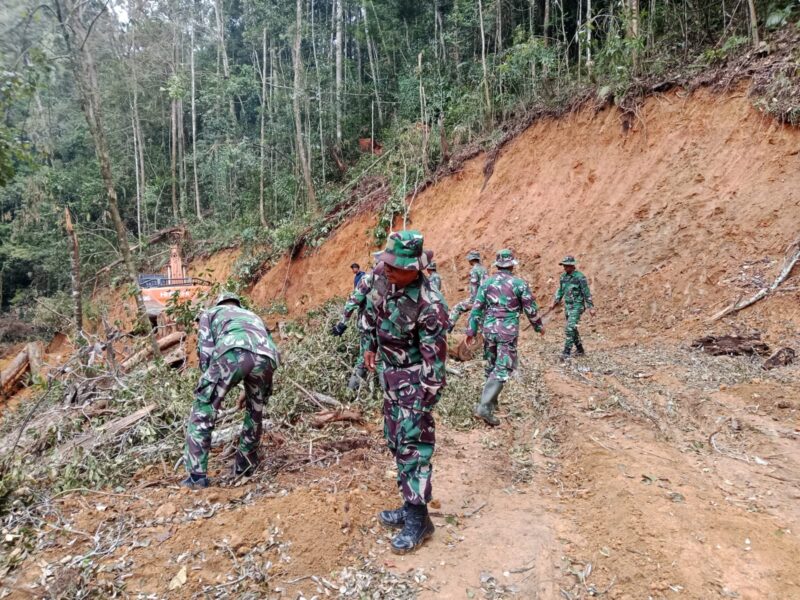 Takengon – pilargayonews.com|Satuan Tugas (Satgas) TNI Manunggal Membangun Desa (TMMD) ke-126 Kodim 0106/Aceh Tengah terus melanjutkan kegiatan fisik di lokasi sasaran. Memasuki hari ke-9 pelaksanaan, Satgas TMMD bersama masyarakat melakukan gotong royong membersihkan pepohonan di sepanjang jalur sasaran TMMD titik nol yang berada di Desa Kute Keramil, Kecamatan Linge, Kabupaten Aceh Tengah.