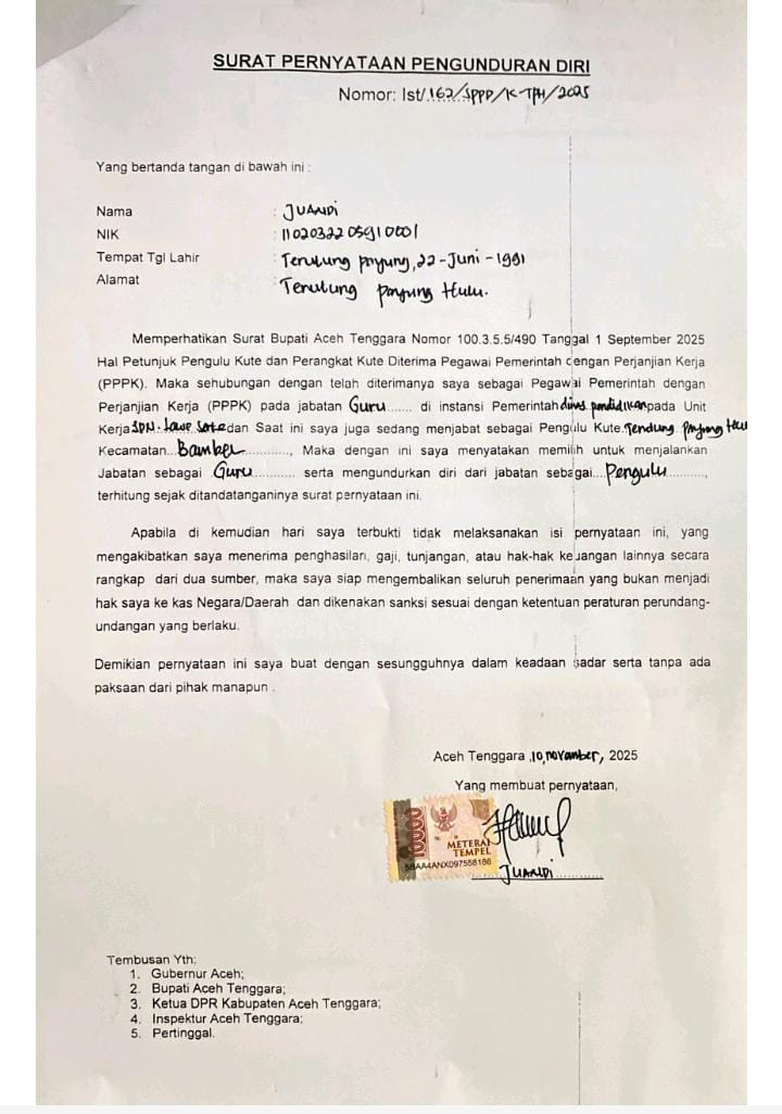 Aceh tenggara – Situasi pemerintahan Desa Terutung Payung Hulu kian memantik kemarahan publik. Kepala Desa Terutung Payung Hulu, Juandi, diketahui telah membuat surat pernyataan pengunduran diri dari jabatannya tertanggal 10 November 2025, yang ditujukan secara resmi kepada Kabag Pemerintahan Kabupaten Aceh Tenggara.