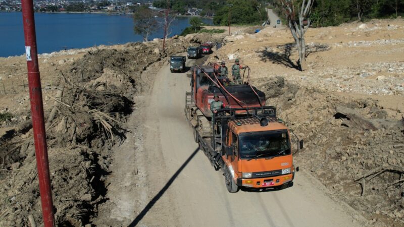 Seperti hari ini alat berat TNI AD terus bekerja membersihkan bahu jalan dan material yang tidak bisa dilakukan dengan manual, semoga cepat jalan ini bersih dan masyarakat bisa beraktivitas seperti biasa” Ujarnya”.